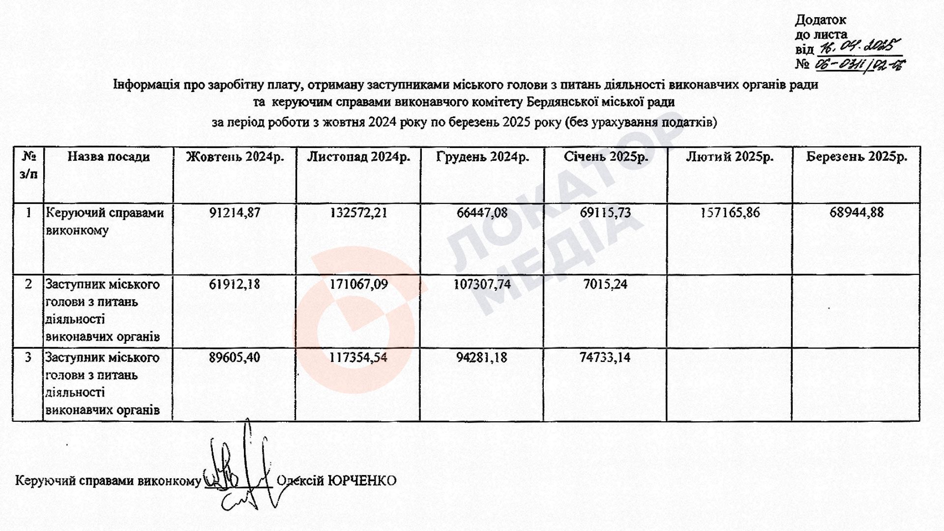 В лютому 2025 року керуючий справами виконкому Бердянської міської ради Олексій Юрченко отримав заробітну плату в розмірі 157 166 гривень. «Локатор-Медіа» дізнався про це у відповідь на запит про зарплату керівництва виконкому БМР з жовтня 2024 по березень 2025 років.