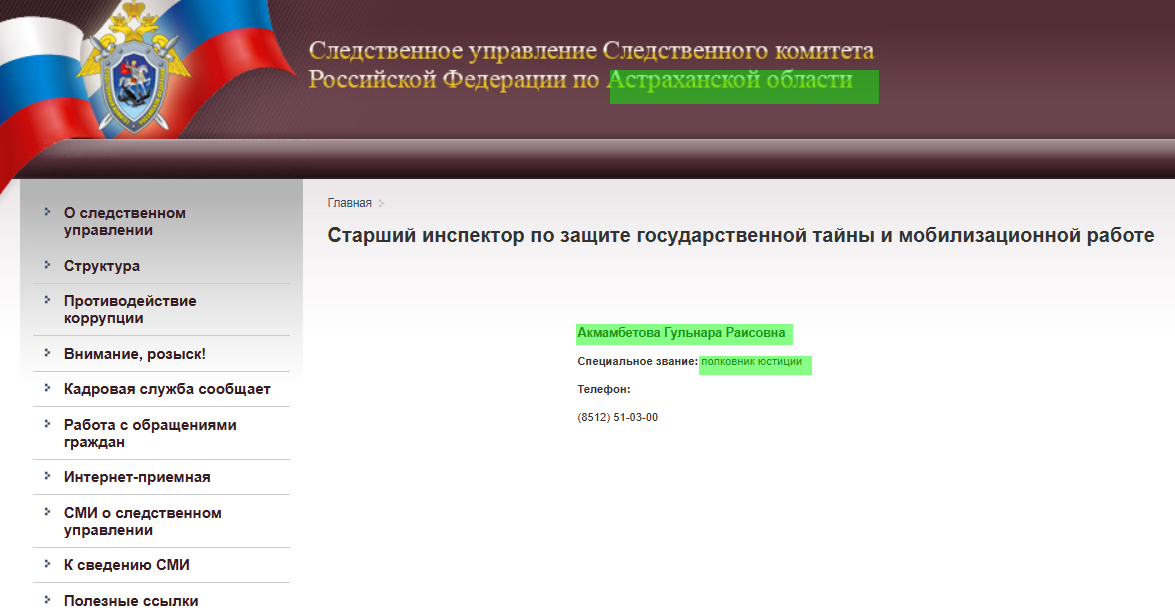 Попередня посада – старший інспектор із захисту державної таємниці та мобілізаційної роботи слідчого комітету російської федерації в Астраханській області.
