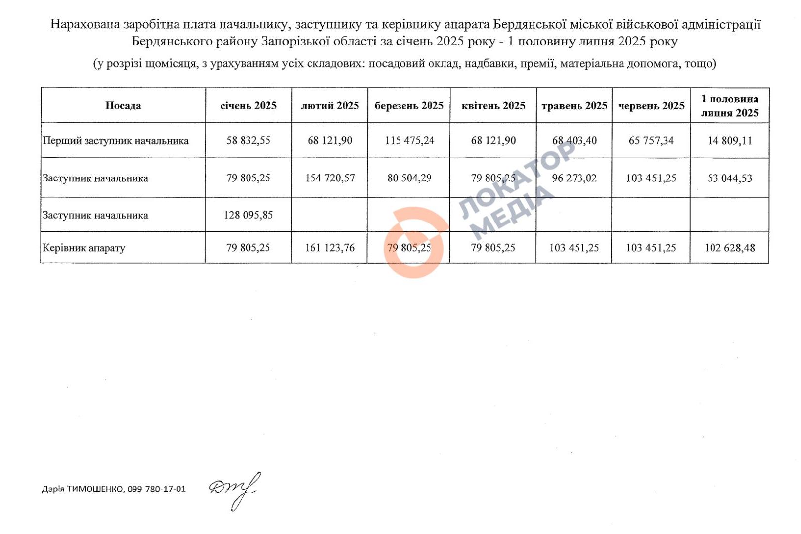 Як бачимо у цій таблиці, зарплата керівника апарату майже на 50% більше, ніж зарплата першого заступника і трохи вище, ніж у заступника начальника Бердянської МВА.