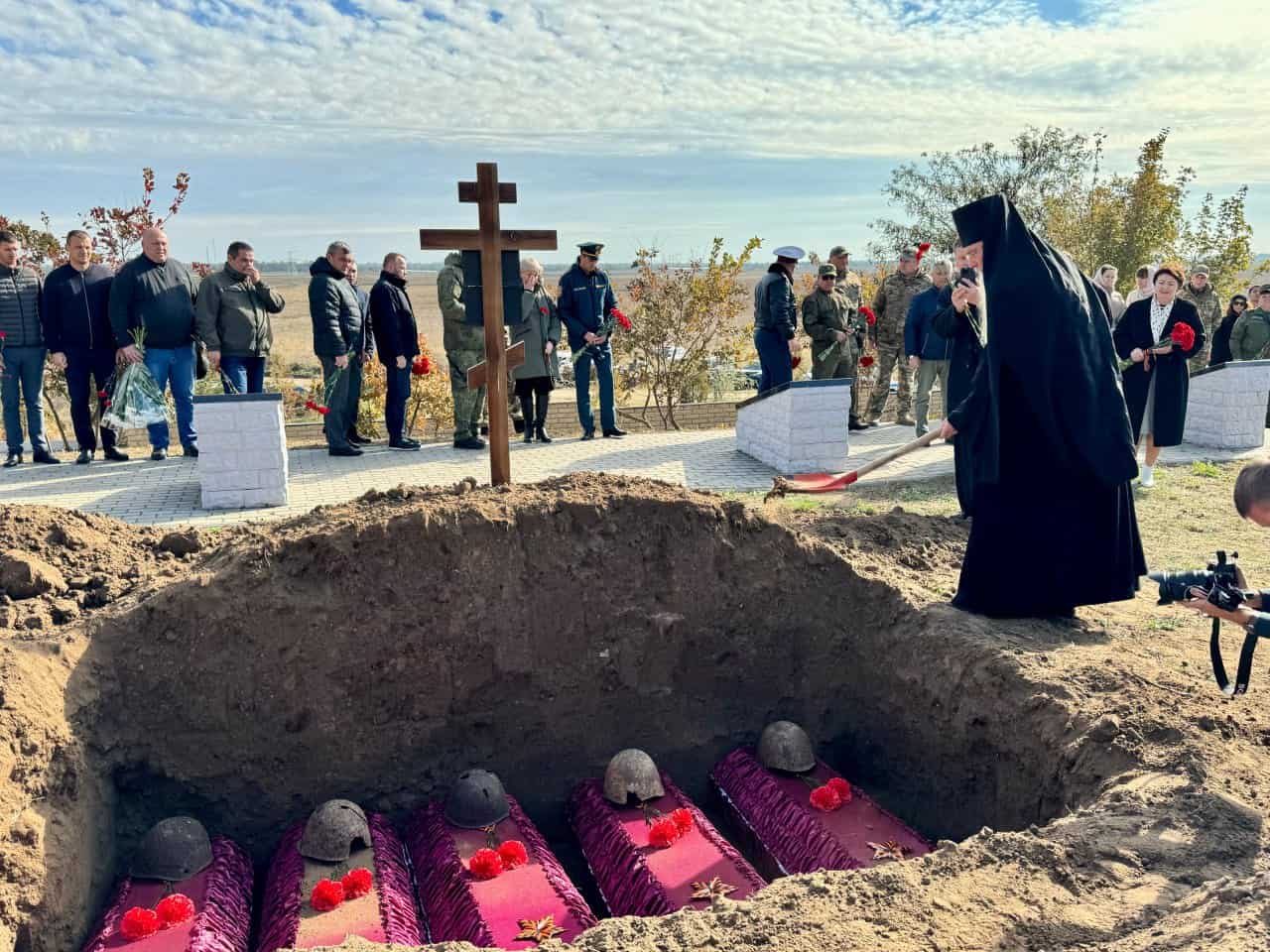 Прибережені до свята останки поховали в неділю 20 жовтня на меморіалі біля села Мордвинівки. Тут рашисти, які відчувають захват від минулого, а тепер, як з’ясувалося і від трупів, уже зробили сакральне місце. Ця нація, у якої в самому серці їхньої столиці лежить труп вождя пролетаріату, перестала дивувати. Захід із поховання червоноармійців, на який нагнали гауляйтерів та військових, чергове шоу на кістках. Це використовується для виховання в населення бажання вчити російську історію з прихованим підтекстом сучасним військовим, щоб ті вступали в армію рф та помирали за путіна – їх теж «родіна» не забуде та поховає.