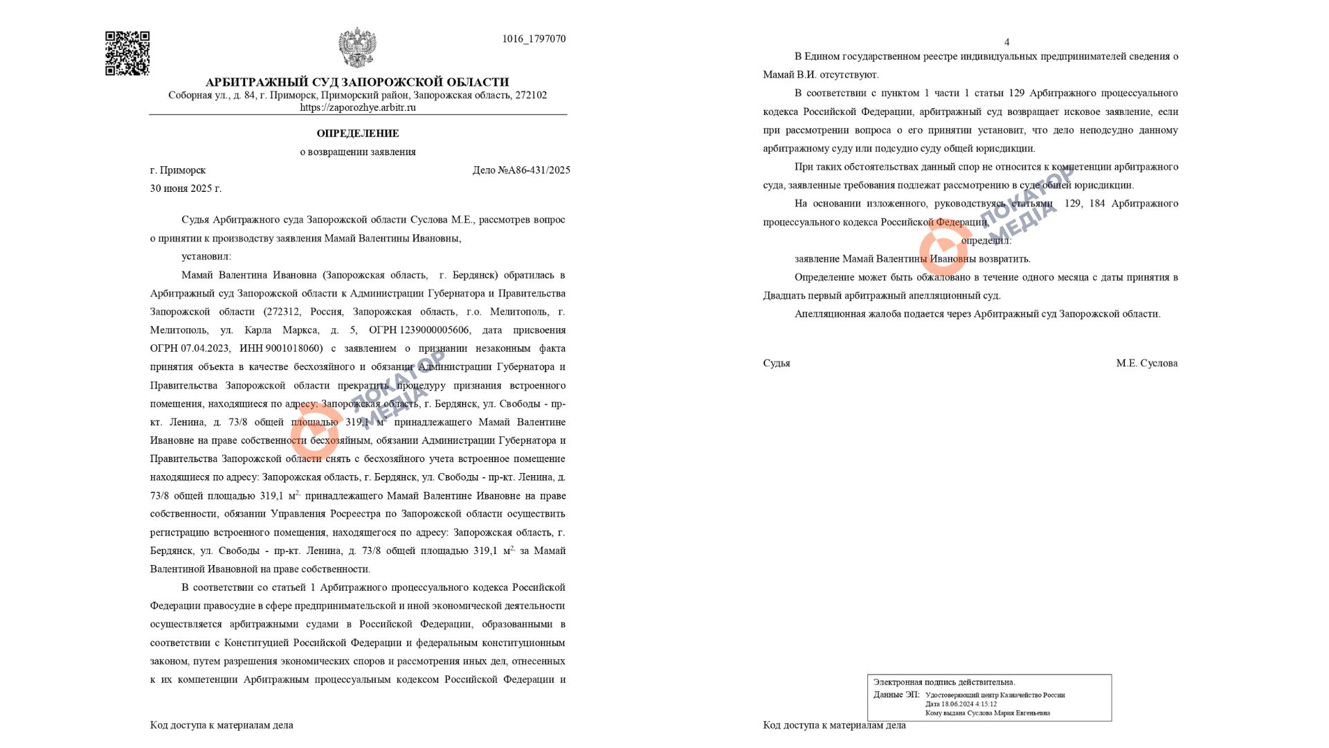 Валентина Мамай звернулась до «суду» із заявою, в якій просила зобов’язати окупаційний «уряд області» припинити цю процедуру та зобов’язати «Управління Росреєстру по Запорізької області» зареєструвати вказану нерухомість за нею. Однак, 30 червня 2025 року «суд» прийняв рішення повернути заяву Валентині Мамай, оскільки вона не зареєстрована підприємцем за законодавством рф.