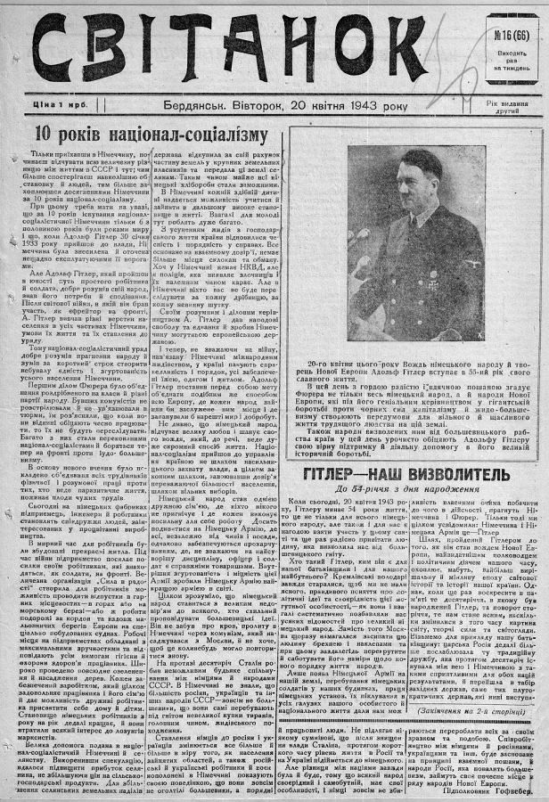 Если эта кровавая страница истории Бердянска известна каждому, то многое из того, чем ещё жил наш город в тот трагический период, остаётся неизвестным. Для того, чтобы приоткрыть этот занавес, обратимся к любопытному первоисточнику – архиву газеты “Світанок” (“Morgendammerung”), выходившей в Бердянске с 23 мая 1942 по 31 августа 1943 г.г. на украинском языке. Антисемитизм, антибольшевизм и пропаганда всего немецкого – таковыми были основные темы публикаций этого издания, типичная передовица которого выглядела вот так.