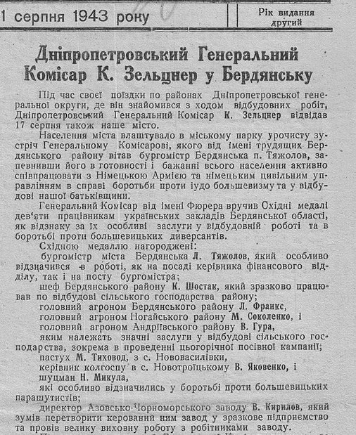 Периодически город посещали высокопоставленные гитлеровские чиновники, как например, Днепропетровский Генеральный Комиссар, который во время своего инспекционного визита вручил от имени Фюрера медали девяти жителям, включая бургомистра Бердянска Л. Тяжолова и шефа Бердянского района К. Шостака.