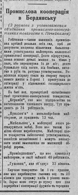 На территории Бердянска действовали шесть торгово-промышленных кооперативов, которые занимались изготовлением глиняной посуды, металлообработкой, реставрацией мебели, пошивом одежды, извозом, а также производством газированной воды, которая реализовывалась в десяти хлебных киосках.