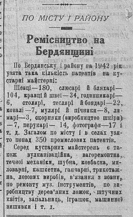 Развитие ремесленничества и открытие кустарных мастерских в оккупированном Бердянске строго контролировались и были возможны только при наличии соответствующего патента.