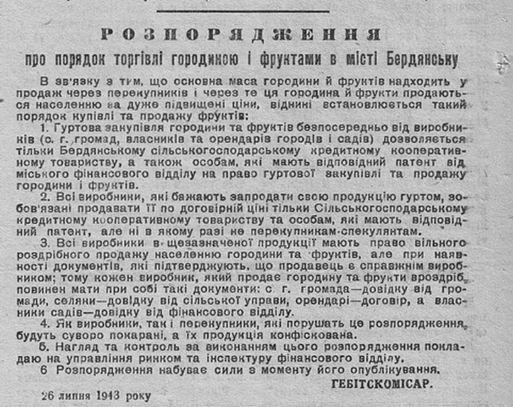 Однако, судя по отдельным публикациям, бердянских спекулянтов это не останавливало. Поэтому по распоряжению штабс-фельдфебеля жандармерии им периодически выписывались штрафы, в том числе и за “злостное повышение цен”. Так, в номер от 5 августа 1942 года читателям сообщалось о применении городским приставом В. И. Саворовским подобных санкций по отношению к двум жителям: Григорию Абрамову с улицы Приморской и Ефросинье Ильюшиной с улицы Подгорной.