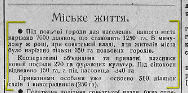 И, по-видимому, такая земля жителям выделялась. Как пример, германскими властями для вышеуказанных целей было нарезано 7600 участков, что почти в 3,5 раза больше, чем при “совєтській владі”.