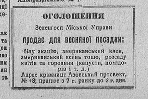 При Городской Управе по адресу: пр. Азовский, 18 действовал Зеленхоз, который предлагал бердянцам для весенней посадки саженцы различных пород деревьев, рассаду цветов и овощей. За деньги.