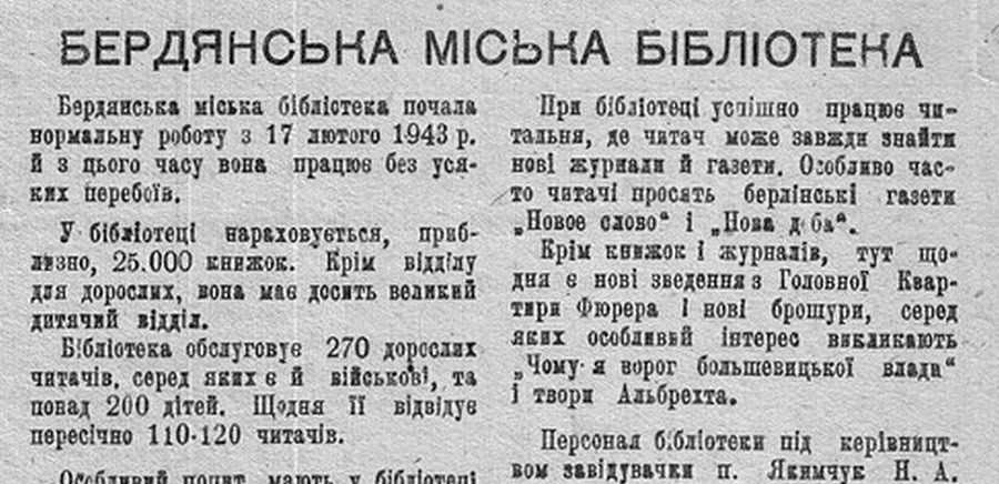 Кроме вышеупомянутого театра, в Бердянске работала библиотека, возобновившая свою работу 17 февраля 1943 года, которую ежедневно посещало более ста читателей, хотя её услуги были платными.