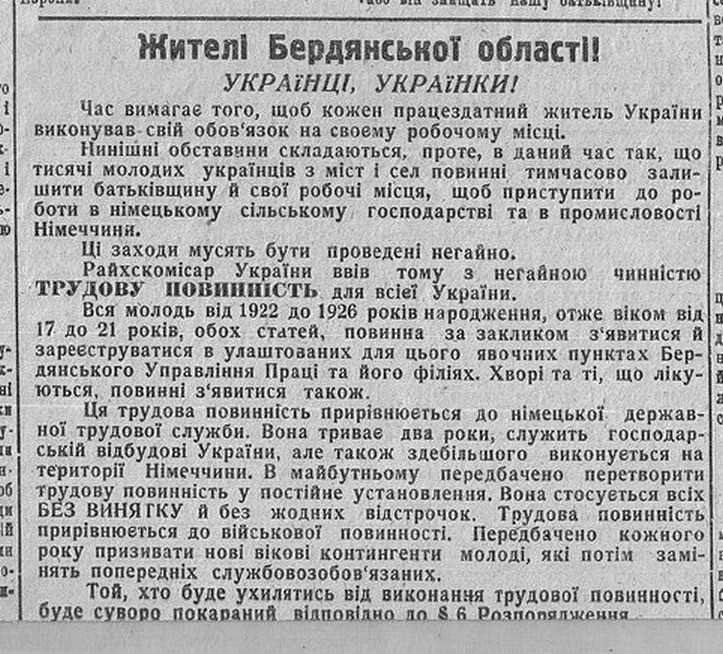 В одном из номеров этого издания сообщалось об объявленной Рейхскомиссариатом обязательной двухлетней трудовой повинности, которая якобы должна была служить “господарській відбудові України”, но в действительности осуществлялась преимущественно на территории Германии. За уклонение от неё опубликованное воззвание грозило строгим наказанием.