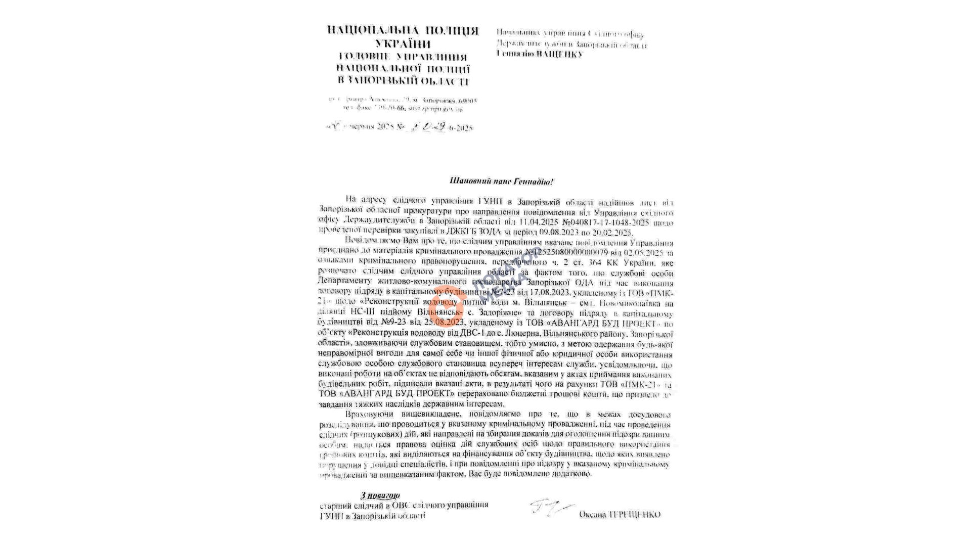 2 травня 2025 року Управління поліції в Запорізькій області відкрило кримінальне провадження за фактом зловживання владою, яке спричинило тяжкі наслідки службовими особами Департаменту ЖКГ Запорізької обласної ради. Справа стосується виконання договорів підряду з реконструкції водоводу питної води м. Вільнянськ – смт. Новомиколаївка (на ділянці НС-ІІІ підйому м. Вільнянськ – с. Задоріжне) та реконструкції водоводу від ДВС-1 до с. Люцерна Вільнянського району.