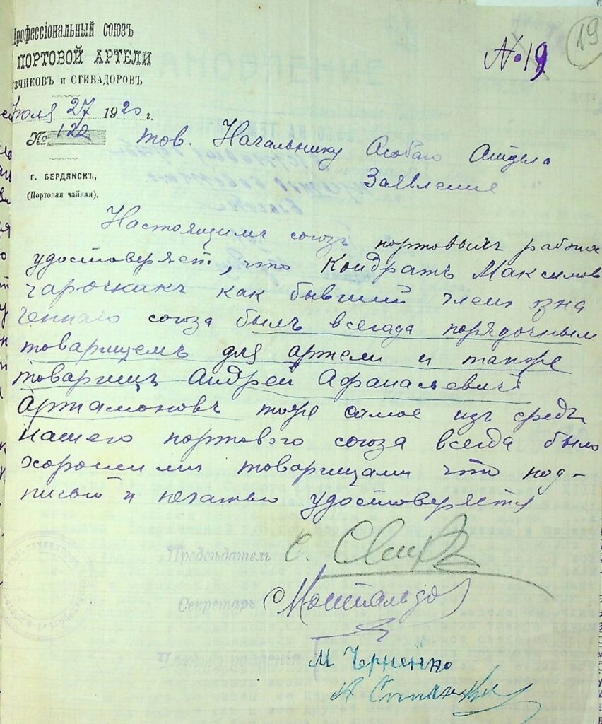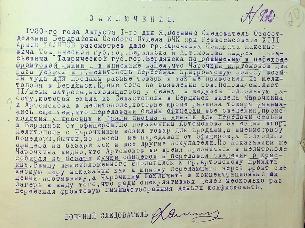 Схоже, така поблажливість до Чарочкіна була пов’язана з тим, що він підтвердив факт спілкування Артамонова з білогвардійцями на мелітопольському ринку.