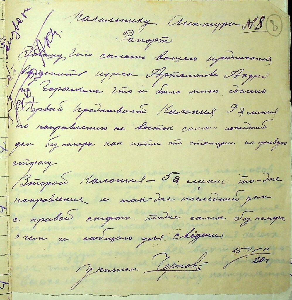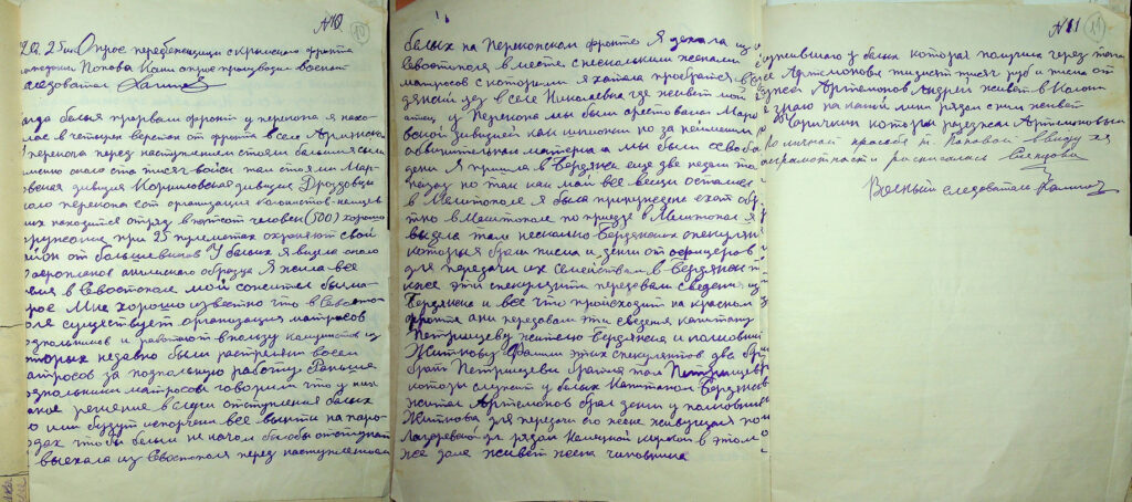 Після прибуття Попова Ксеня (так її ім’я вказано в протоколі опитування) відразу ж вирушила до Особливого відділу Бердянського району при Реввійськраді XIII-ї армії, який займався контррозвідкою. Там вона повідомила, що їздила до Мелітополя за особистими речами та познайомилася із візниками.
