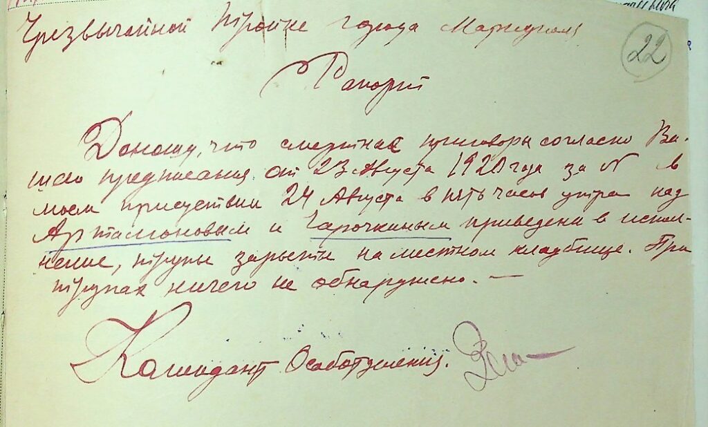 і 23 серпня о 5 годині ранку бердянці Андрій Артамонов та Кіндрат Чарочкін були розстріляні і поховані на маріупольському цвинтарі у присутності коменданта місцевого Особвідділення.
