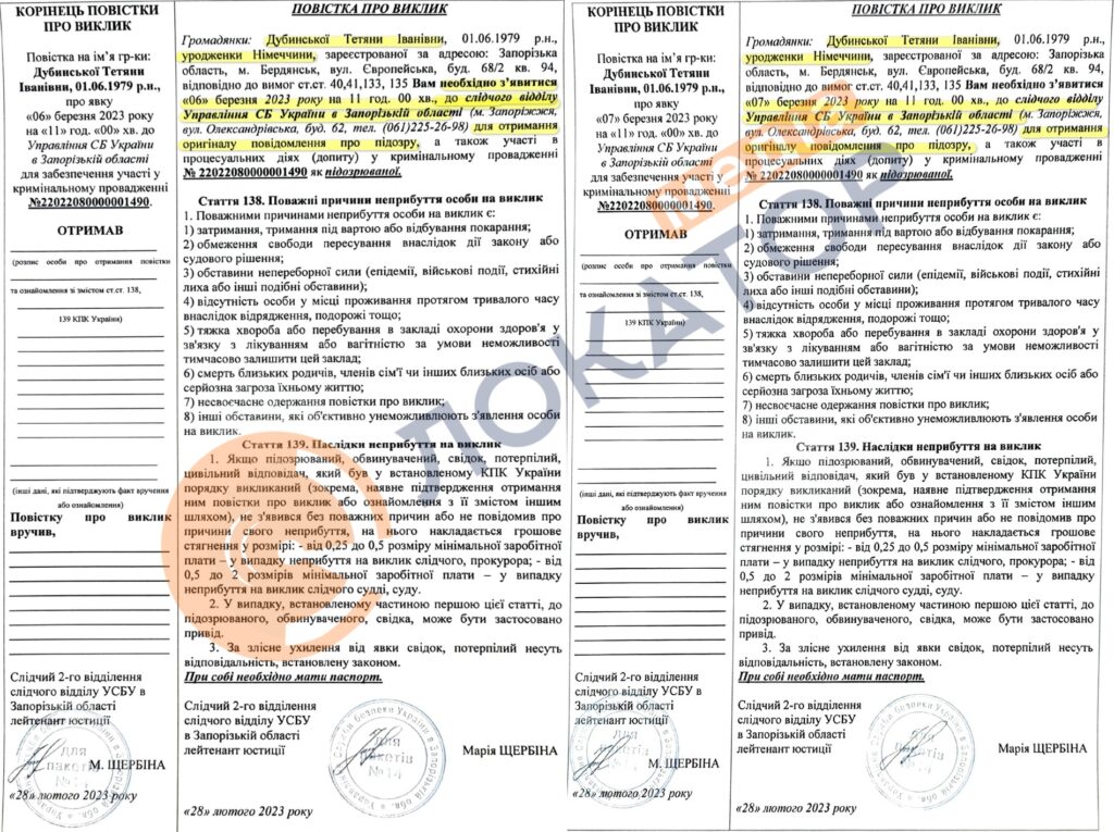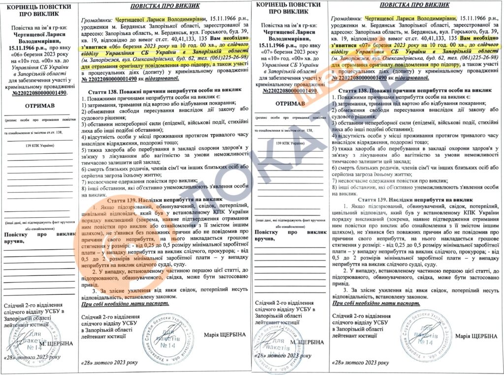 Служба безпеки України викликає на 6 та 7 березня до Запоріжжя бердянських вчительок Тетяну Дубинську та Ларису Чертищеву для отримання підозр та проведення інших слідчих дій. Після окупації міста вони перейшли на бік агресора та добровільно зайняли незаконні посади директорів шкіл №1 та №2 відповідно.