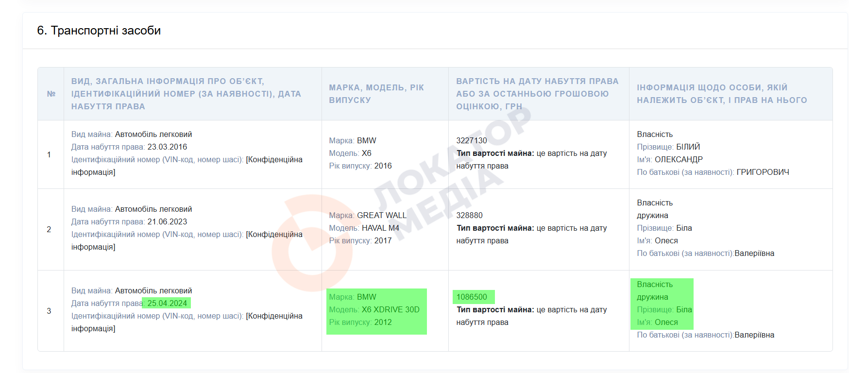 Має авто BMW X6 і сам Олександр Білий. Він його придбав з салону в березні 2016 року за 3,2 мільйона гривень.
