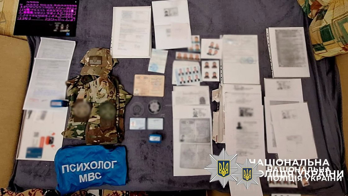 У зловмисника провели серію санкціонованих обшуків та вилучили речі з символікою Нацполіції та інших правоохоронних відомств, посвідчення, штампи і печатки, копії документів різних осіб.